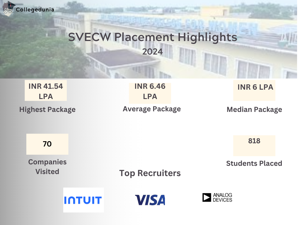 Students at Shri Vishnu Engineering College for Women become eligible for placements starting from the 6th semester. The college boasts a strong placement record, with over 90% of students getting placed each year. Top companies such as Amazon, Flipkart, TCS, Infosys, Capgemini, and Adobe frequently visit the campus. The highest package offered in recent years has been around 49 LPA, with the average package ranging from 6 to 8 LPA.