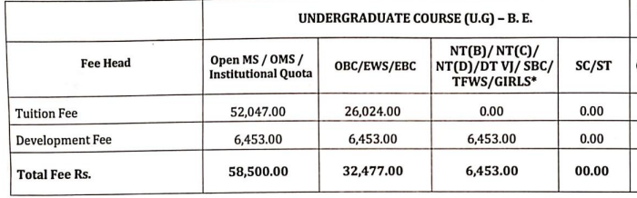 For Bachelor of Engineering (Computer Engineering) students meeting CET and cutoff criteria, the fee is 65,000. Caste and category-based scholarships reduce fees to 20,000-40,000 for eligible students. Additional scholarships are available through exams or for differently-abled students, with flexible payment options provided.