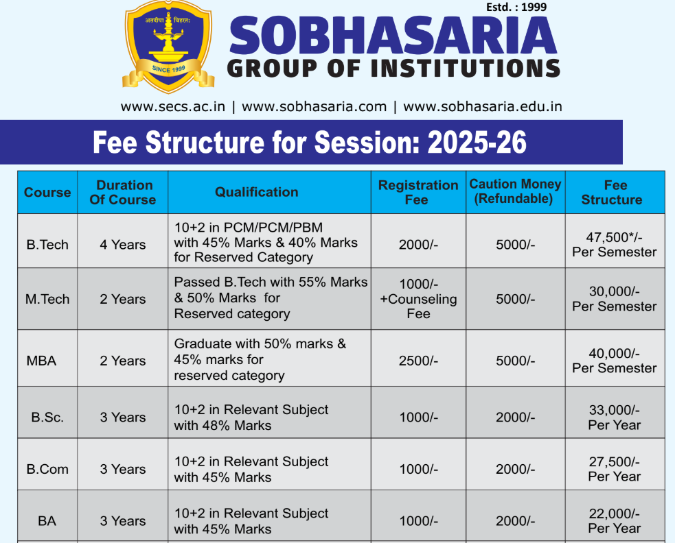 M.Tech Computer Science And Engineering at Sobhasaria Group Of Institutions Sikar is a 2 Years Degree. The course is offered On Campus as a Full Time program. Sobhasaria Group Of Institutions Sikar M.Tech Computer Science And Engineering First Year Fees is INR 66,000 for 2025.