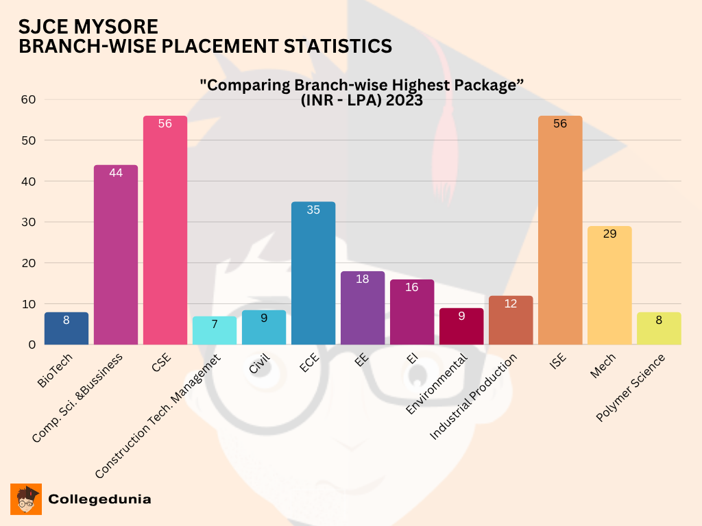 SJCE Mysore has not released its 2025 placement report yet. The most recent placement report is from 2023. The highest salary package offered in 2023 was INR 56 LPA. A total of 752 B.Tech, 78 M.Tech, and 77 MCA students were placed in the recruitment process. The college has top recruiting companies like TCS, Infosys, Titan, Tech Mahindra, Bosch, Microsoft, Intel, Mercedes-Benz, and Sony. SJCE Mysore Placement details are listed below.