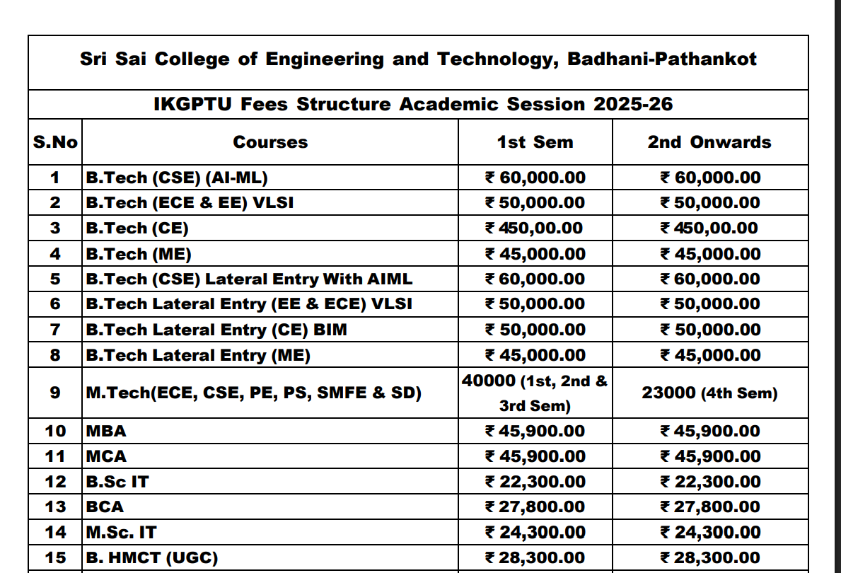 B.Tech {Lateral} Civil Engineering at Sri Sai College of Engineering and Technology Pathankot is a 3 Years Degree. The course is offered On Campus as a Full Time program. Sri Sai College of Engineering and Technology Pathankot B.Tech {Lateral} Civil Engineering First Year Fees is INR 1,05,000 for 2025.