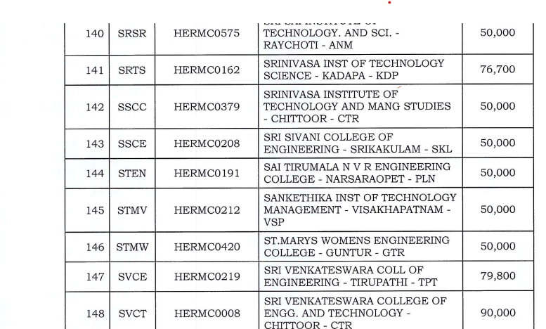 Fees Offered by the College as per Govt order
