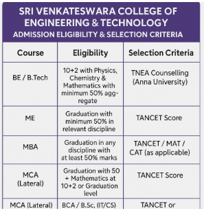 Sri Venkateswara College of Engineering & Technology offers admission to BE/B.Tech, ME, MBA and MCA programs for the 2025 session through both government quota and management quota. BE/B.Tech admissions are done via TNEA counselling while PG programs including MBA, MCA, and ME are based on TANCET scores conducted by Anna University. The admission process is carried out online through the official Sri Venkateswara College of Engineering & Technology portal.