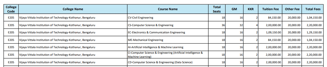 Sri Vijaya Vittala Institute of Technology Bangalore KCET Cutoff 2025 rank is 184366 for the 1G category. Further, the cutoff rank is 210961 for 2AG category, 199498 for 2BG category, Earlier, the KCET cutoff rank 2024 was 207469 - 233822 for the 1G category.
