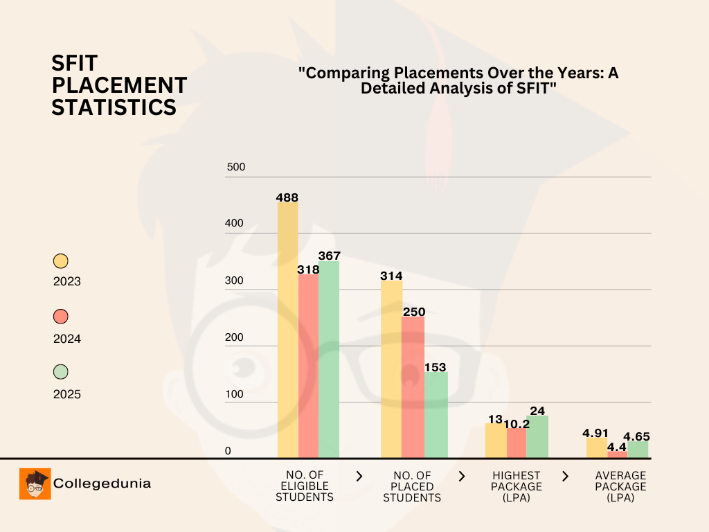 SFIT Placement Report for 2025 has been released. The highest package stands at INR 24 LPA, while the average package is INR 4.65 LPA. In 2024, the highest package offered was INR 10.2 LPA while the average package was INR 4.4 LPA. Oracle, Tech Mahindra, TCS, Infosys, Accenture, Capgemini, Hexaware, IBM, HCL, Reliance Jio, and many more are the past recruiters at SFIT Placement.