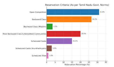 The Tamil Nadu government follows a structured reservation system for admissions, with the highest share allotted to the Open Competition (31%) followed by Backward Classes and Most Backward Classes. Special provisions are also made for SC (Arunthathiyars) and ST candidates.