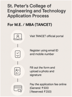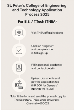St. Peter’s College of Engineering and Technology follows centralized admission procedures governed by Anna University through TNEA (for UG courses) and TANCET/TANCA (for PG courses). Below is the detailed admission breakdown: