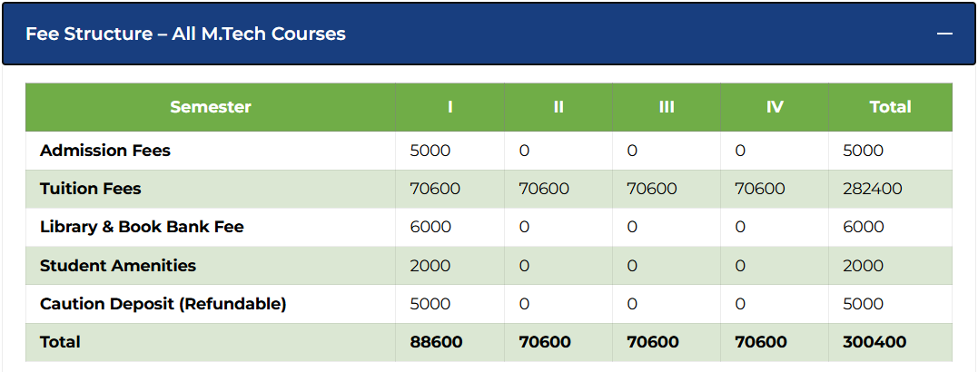 | Semester Wise Fees | ₹88600 | ₹70600 | ₹70600 | ₹70600 |