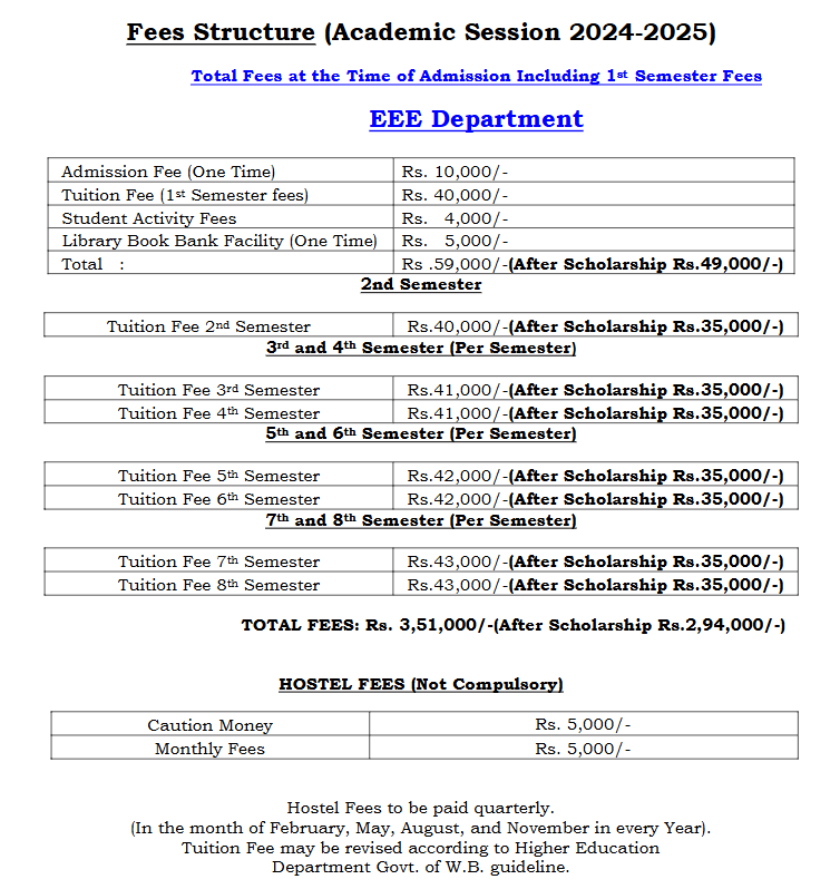 Admission to Swami Vivekananda Institute of Science and Technology is available directly, especially for students with favorable WBJEE results. The campus environment and supportive faculty are highly regarded, with faculty members being accessible and helpful to students. The admission fee is INR 30,000, covering the first semester, followed by INR 25,000 for each subsequent semester. Additional costs include hostel fees of INR 4,000 per month. The program is in the Electric and Electronics Engineering department.