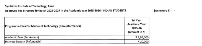 Earlier, M.Tech Geoinformatics fees at SIT Pune was ₹ 6.1 Lakhs (in 2025) for the entire course duration. This shows that the fee has remained unchanged since 2025.