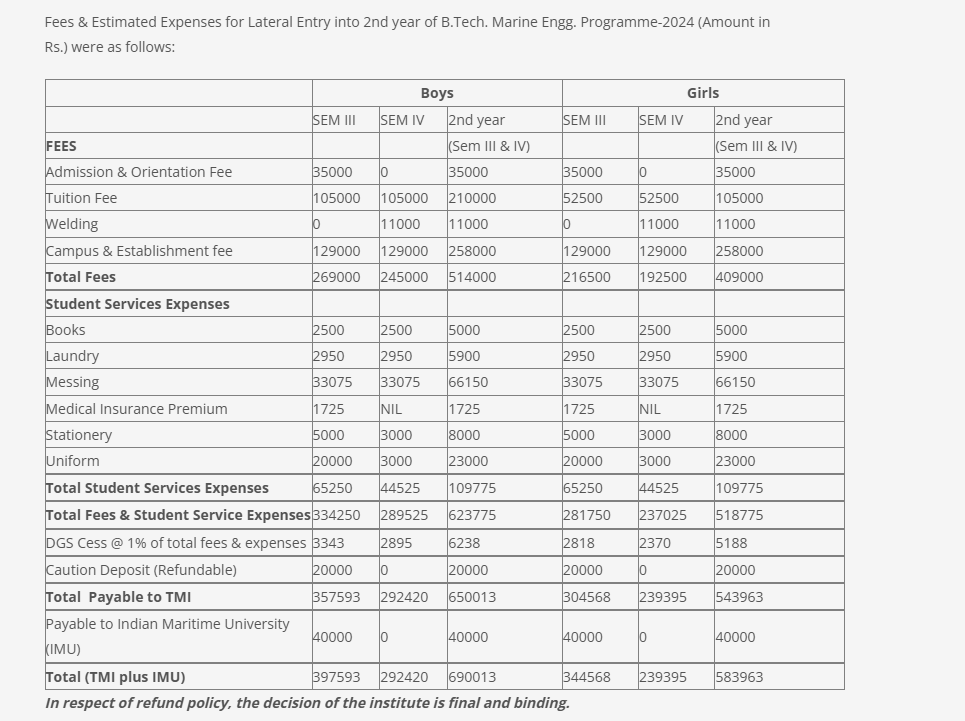 Tolani Maritime Institute Pune B.Tech {Lateral} Marine Engineering is offered as 3 Years Full Time program. The minimum eligibility criteria for B.Tech {Lateral} is Diploma with 55%. The total fees for Tolani Maritime Institute Pune B.Tech {Lateral} Marine Engineering in 2025 is ₹ 18.6 Lakhs for the complete course duration, which includes total tuition fees of ₹ 18.6 Lakhs. Earlier, the fees in 2022 - 2023 for B.Tech {Lateral} Marine Engineering was ₹ 19.33 Lakhs.
