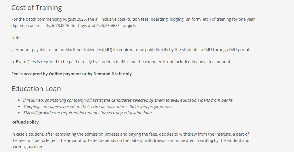 Graduates typically undergo 18 months of cadetship training on ships, with salary packages ranging from 12 to 15 lakh INR annually. The cost for the programs is approximately 5 lakh INR per annum, with a total educational expense of around 7,80,000 INR. This includes 2.35 lakh INR per semester for academics and an additional 3,00,000 INR for hostel and other amenities. Financial assistance is available, especially to encourage female admissions, and scholarships are provided to the top 40 ranking students, adjusting their fees accordingly.