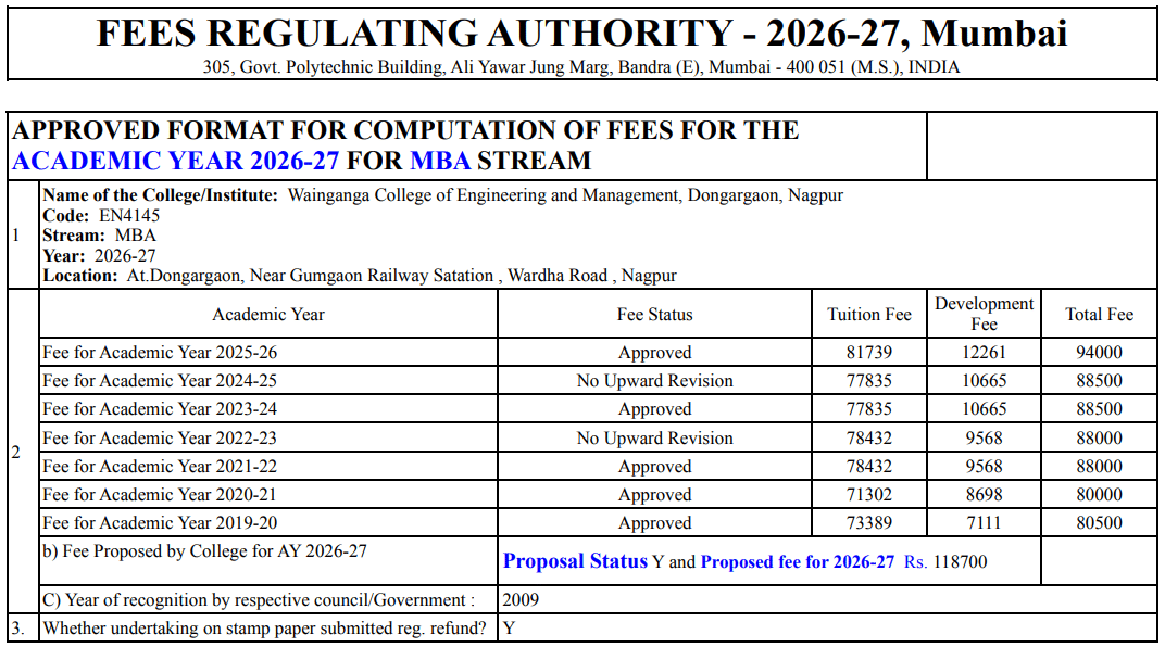 22 Sep, 2025 Wainganga College of Engineering and Management Nagpur has released MBA Project Management Fee Structure for AY 2025-26. The total academic fee is ₹ 2.37 Lakhs.