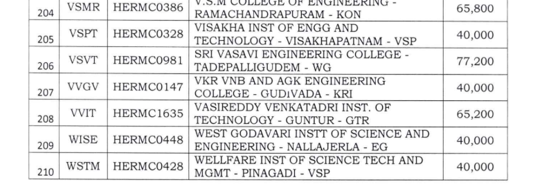 Fees Offered by the College as per Govt order
