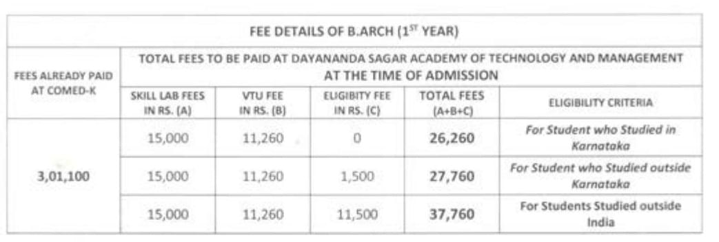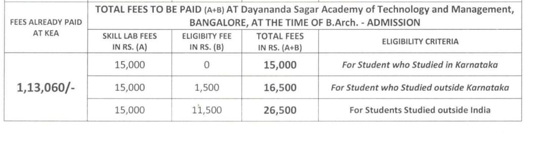 Fee Details for B.Arch 2025-2026 KEA/CET Quota –