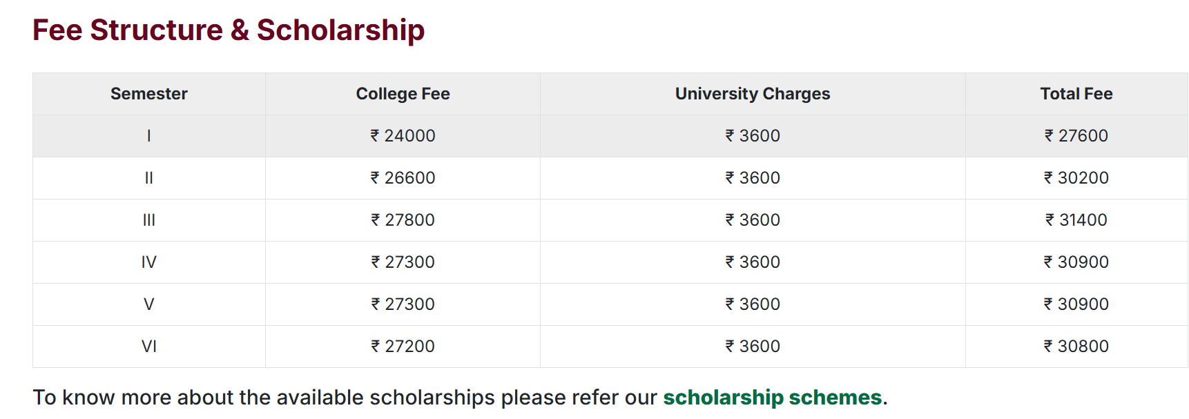 | Semester Wise Fees | 27600 | 30200 | 31400 | 30900 | 30900 | 30800 |