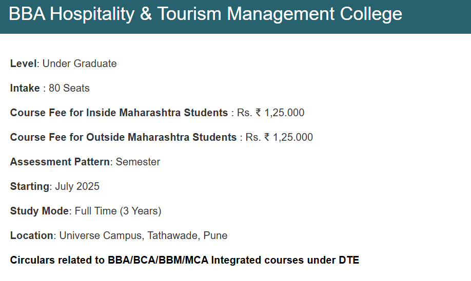 Indira College of Commerce & Science Tathawade BBA (H&T) Hospitality & Tourism is offered as 3 Years Full Time program, with total intake of 80 seats. The minimum eligibility criteria for BBA (H&T) is 10+2 with 40%. The total fees for Indira College of Commerce & Science Tathawade BBA (H&T) Hospitality & Tourism in 2025 is ₹ 1.25 Lakhs for the complete course duration.