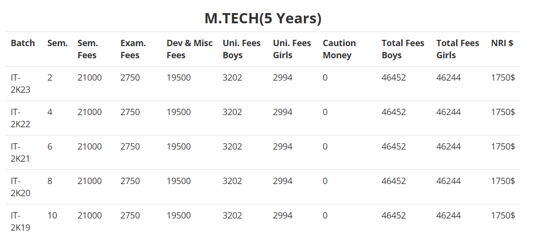 The college also provides paid internships with stipends between 10,000 and 15,000 INR and offers placement preparation training. Annual fees are split into two semesters, with each costing approximately 46,000-48,000 INR, resulting in a yearly fee of about 92,916 INR for the M.Tech Integrated course. A 1-2% annual fee increment is standard, and there has been a historical fee increase for new batches, with the 2016 batch paying 70,000 INR per year and the 2017 batch 90,000 INR.