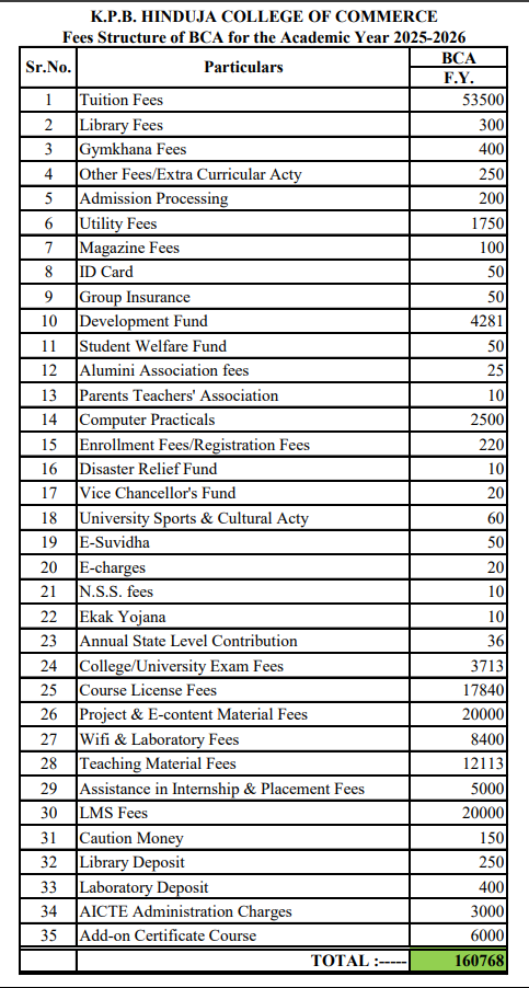Admission to K. P. B. Hinduja College of Commerce is merit-based, with multiple admission lists released every 2-3 weeks. While most courses do not require entrance exams or interviews, some use a first-come, first-served approach and personal interviews. Direct admission is available for the BCA course, which is offered in collaboration with Yashwantrao Chavan Maharashtra Open University (YCMOU). The BCA program spans six semesters and costs around 90,000 INR for the entire three-year duration, with an annual fee of approximately 30,000 to 32,000 INR.