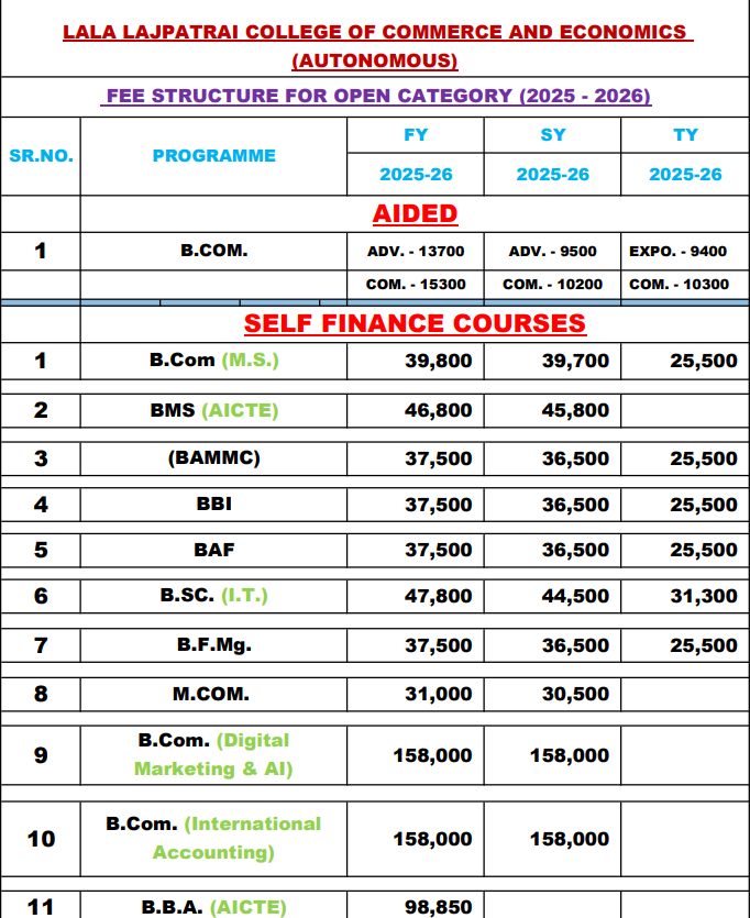 M.Com Business Management at Lala Lajpat Rai College of Commerce and Economics Mumbai is a 2 Years Degree. The course is offered On Campus as a Full Time program. Lala Lajpat Rai College of Commerce and Economics Mumbai M.Com Business Management First Year Fees is INR 31,500 for 2025.