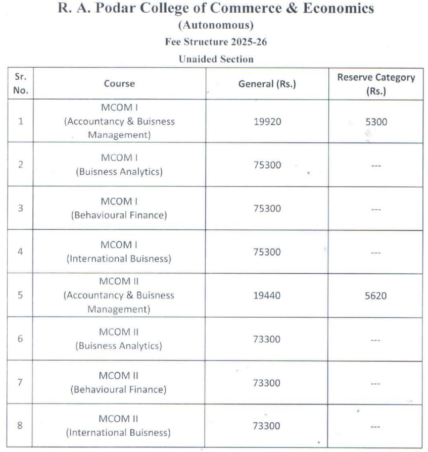 M.Com International Business at RA Podar College of Commerce and Economics Mumbai is a 2 Years Degree. The course is offered On Campus as a Full Time program. RA Podar College of Commerce and Economics Mumbai M.Com International Business First Year Fees is INR 75,300 for 2025.