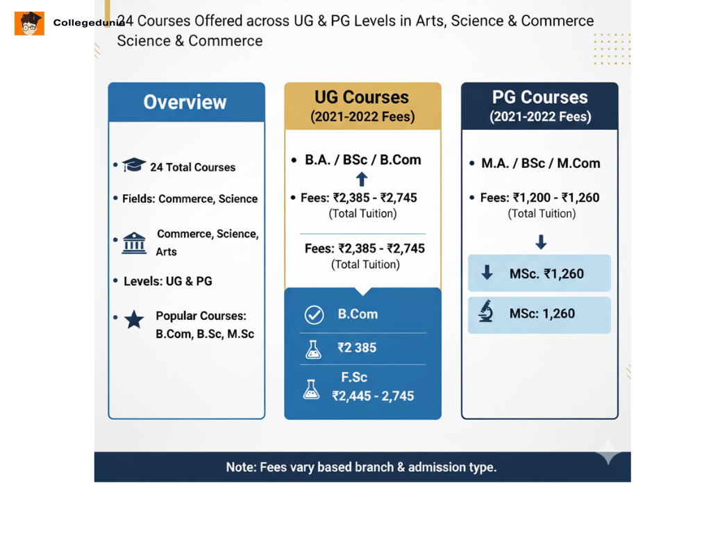BCW courses are offered at the UG, PG levels, but the fees for 2025 have not been updated yet. There are 24 courses offered at BCW. The courses are offered in fields like Commerce, Science, and Arts. BWC courses include B.Com, B.Sc, M.Sc, BA, M.Com, and MA. The popular courses at BWC are B.Com, B.Sc., and MSc.However, the Fees structure has not been updated yet. According to the oLd fees structure the details of all courses are mentioned as follows.