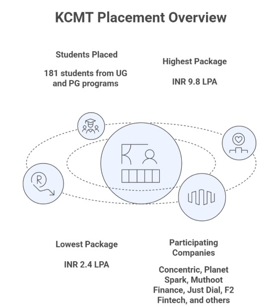 KCMT in 2025 reported a package of INR 9.8 LPA as the highest secured offer by its students. The lowest package secured is INR 2.4 LPA. Top recruiters include companies such as Concentric, Planet Spark, Muthoot Finance, Just Dial, F2 Fintech, and many more.