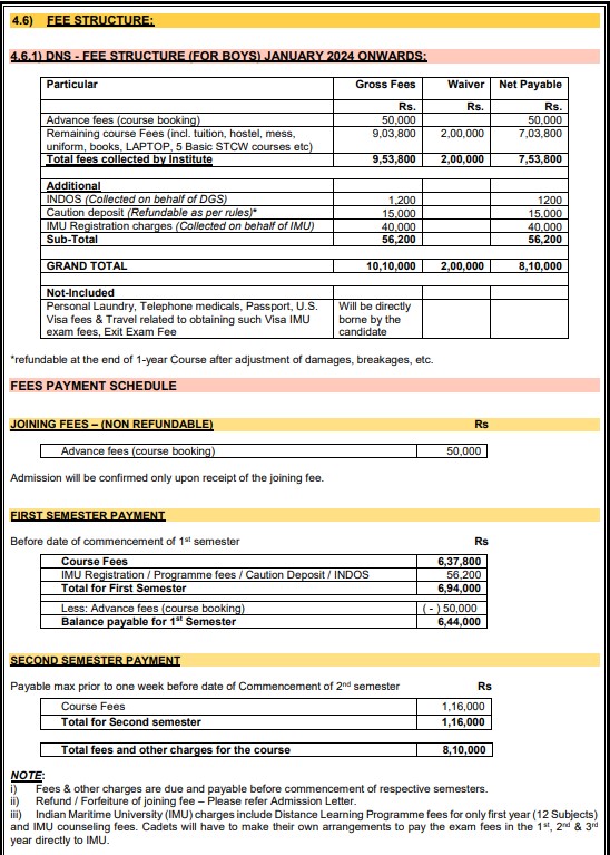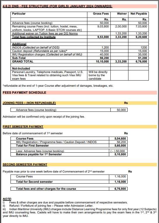 Graduates start as deck cadets and undergo further training, including an 18-month internship. Financial aid options are available, with some scholarships and loans covering 50-100% of fees based on family income. The total program fee includes hostel and mess fees amounting to 760,000 INR, with an additional 5,000 INR for exam fees. The college maintains a 100% placement rate, and fees may vary annually depending on facility offerings.