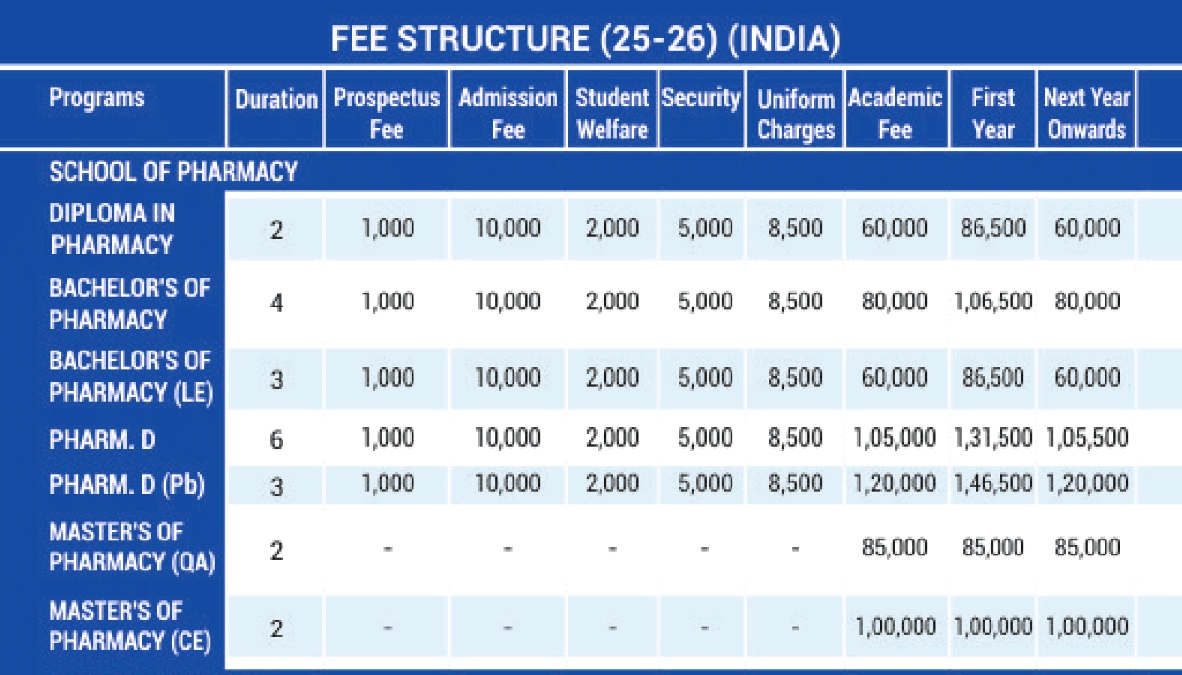 | Fees (2024 - 2025) | Year 1 (in INR) | Year 2 (in INR) | Year 3 (in INR) |