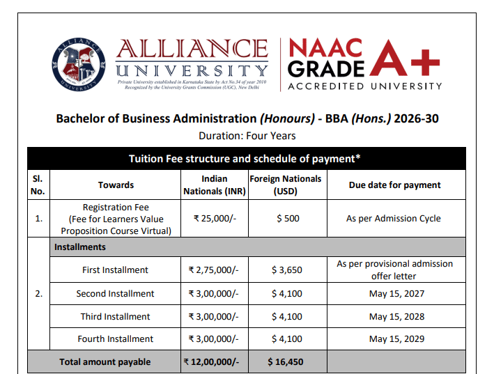 Earlier, BBA {Hons.} fees at Alliance School of Business Bangalore was ₹ 12 Lakhs (in 2025) for the entire course duration. This shows that the fee has remained unchanged since 2025.