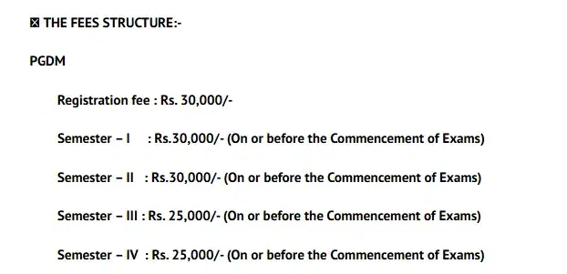 The PGDM fee structure includes a registration fee of Rs 30,000, followed by semester-wise fees of Rs 30,000 each for Semester I and II, and Rs 25,000 each for Semester III and IV. All semester fees are payable on or before the commencement of exams.