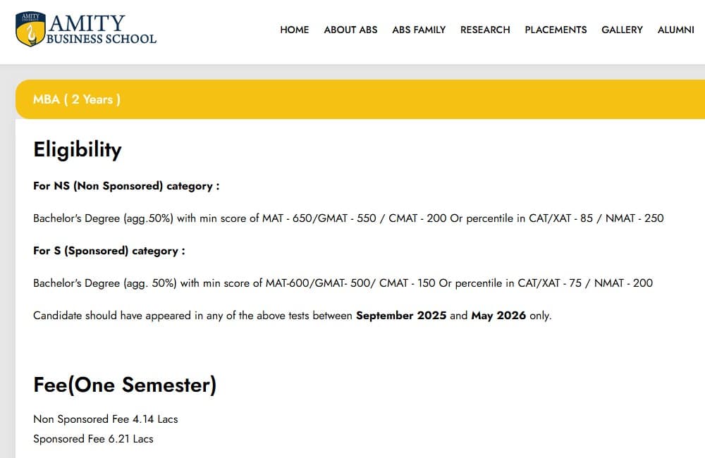 Earlier, MBA fees at Amity Business School Noida was ₹ 15.8 Lakhs (in 2025) for the entire course duration. This shows a fee increase of ₹ 76,000 over the year.