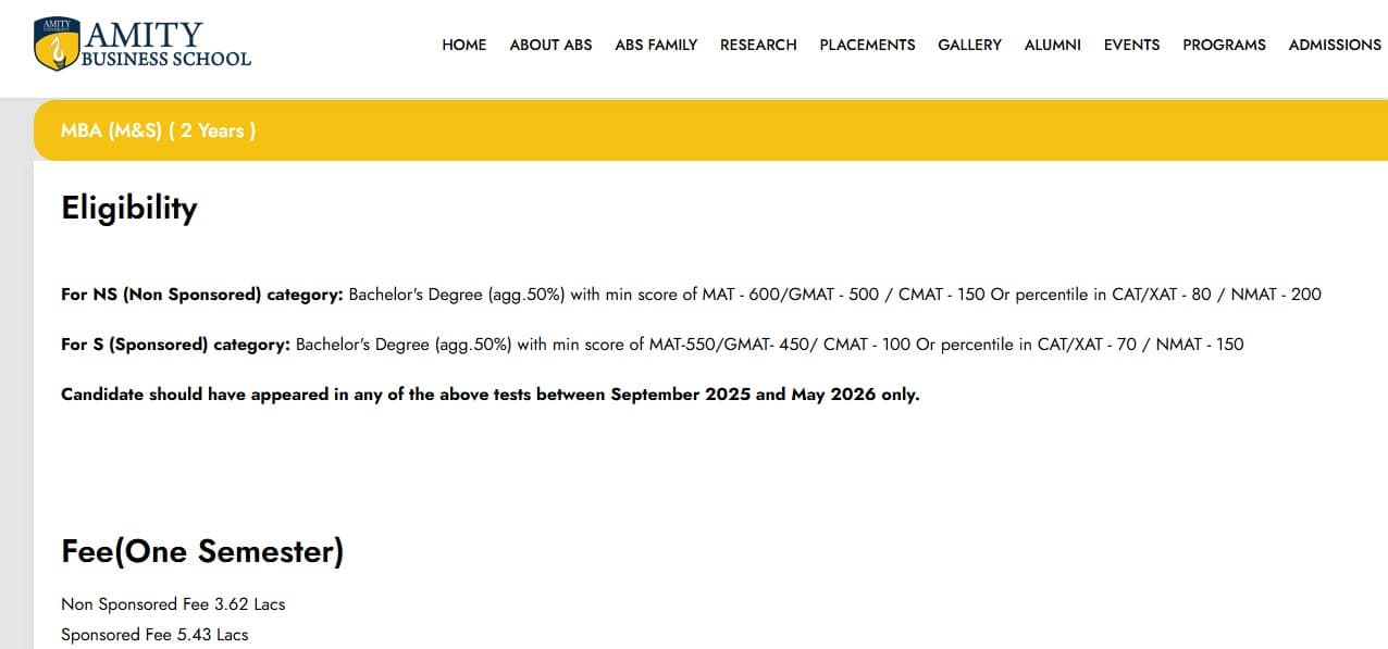 Earlier, MBA Sales & Marketing fees at Amity Business School Noida was ₹ 15.8 Lakhs (in 2025) for the entire course duration. This shows a fee decrease of ₹ 1.32 Lakhs over the year.