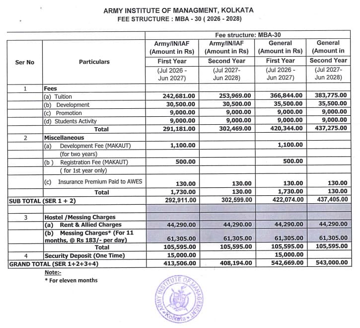 Earlier, MBA fees at Army Institute of Management Kolkata was ₹ 8.29 Lakhs (in 2025) for the entire course duration. This shows a fee increase of ₹ 45,744 over the year.