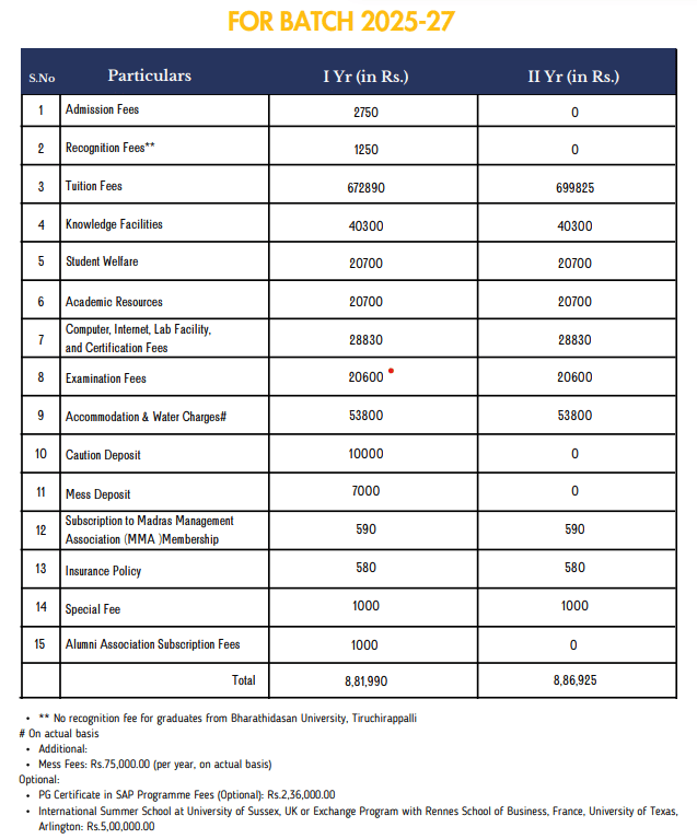 The cost covers tuition, stay, and a joining deposit, with first-year fees about 1 lakh higher than the second year. Financing options are available, though mess fees are separate. Placement rates vary with economic conditions, but BIM generally achieves strong placements, especially for Trichy. Internships and placements occur mainly in finance, marketing, and information systems, though multiple offers to candidates can limit opportunities for others. The reviewer did not use scholarships or education loans, choosing instead to borrow from a family member and repaying within a year post-graduation.