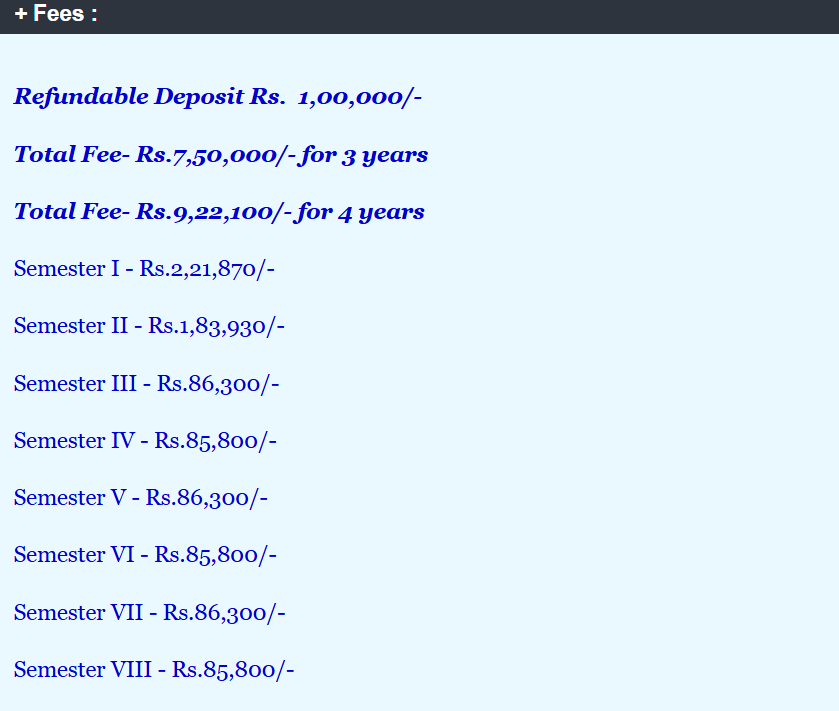 | Semester Wise Fees | ₹298870 | ₹252800 | ₹86300 | ₹85800 | ₹86300 | ₹85800 |