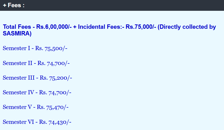 | Semester Wise Fees | ₹75500 | ₹74700 | ₹75200 | ₹74700 | ₹75470 | ₹74430 |
