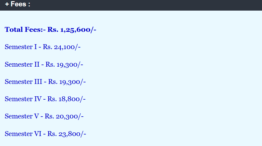 | Semester Wise Fees | ₹18700 | ₹15900 | ₹16400 | ₹15900 | ₹15570 | ₹18800 |