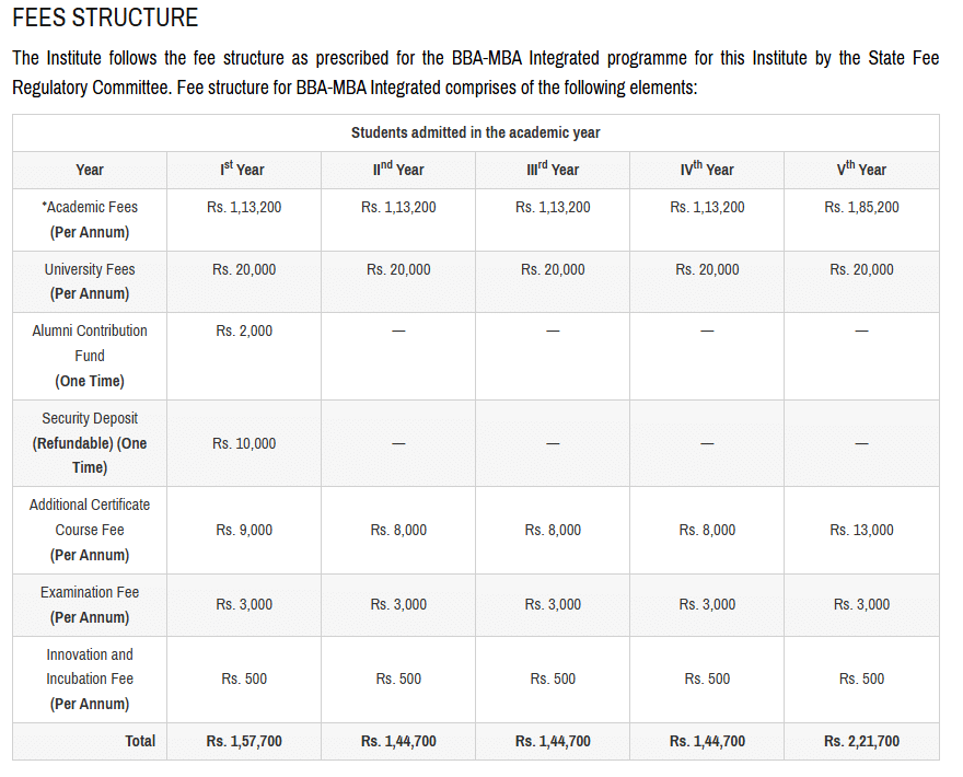 The BBA-MBA Integrated program has yearly fees of 1,50,000 INR for the first four years and around 2,00,000 INR for the fifth year. Admission requires an initial fee of 40,800 INR plus an additional 9,000 INR. Scholarships are available, though details are unspecified.