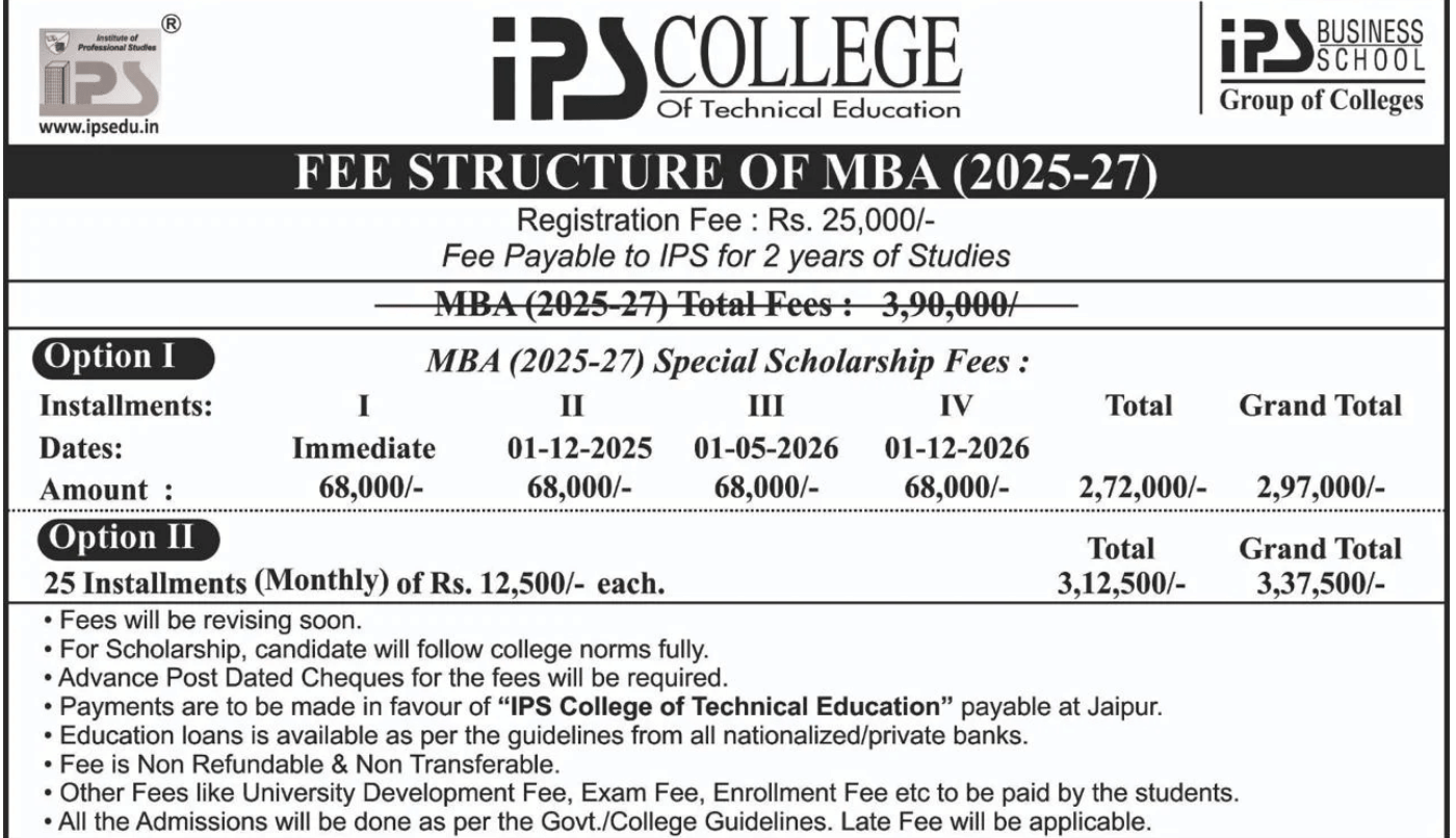 IPS Business School Jaipur MBA fees in first year is ₹ 1.61 Lakhs. The detailed fees is mentioned below.IPS Business School Jaipur Hostel Fee is ₹ 78,000 to 90,000.