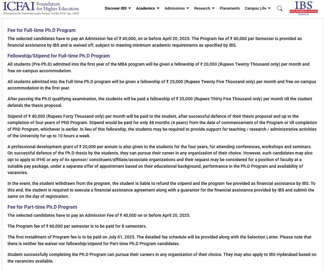 Earlier, Ph.D Finance fees at IBS Hyderabad was ₹ 5.2 Lakhs (in 2024) for the entire course duration. This shows that the fee has remained unchanged since 2024.