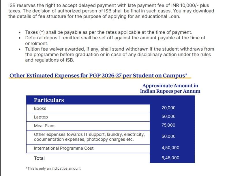 Ans. The total fee is INR 45,12,160 for the one-year program. ISB does not provide semester-wise splits publicly.