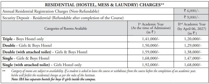 IBA offers three types of hostel accommodations: triple sharing, double sharing, and single rooms, with annual fees of Rs. 84,000, Rs. 96,000, and Rs. 110,000 respectively. Separate facilities are provided for boys and girls, and all students are required to reside on-campus due to the full-time residential nature of the MBA and PGDM programs. The hostels feature a mix of attached and common bathrooms, with clean, well-maintained rooms that include basic furniture like beds, desks, and wardrobes.