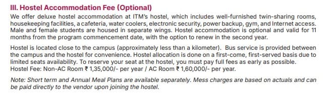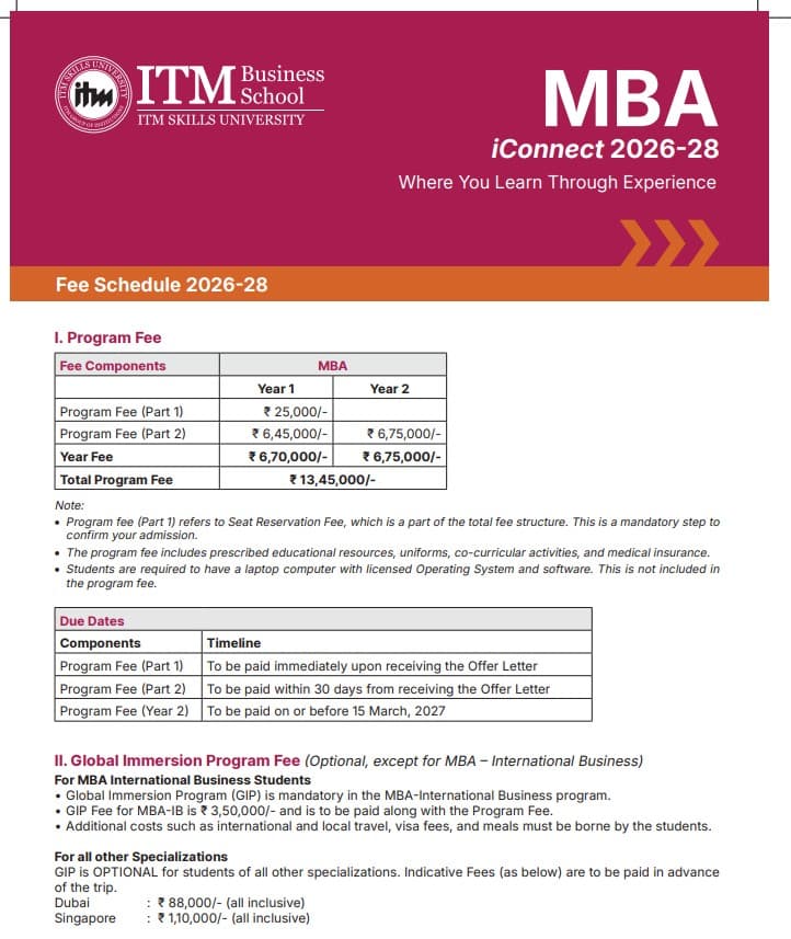 Earlier, MBA Fintech fees at ITM Navi Mumbai was ₹ 12.45 Lakhs (in 2025) for the entire course duration. This shows a fee increase of ₹ 1 Lakh over the year.