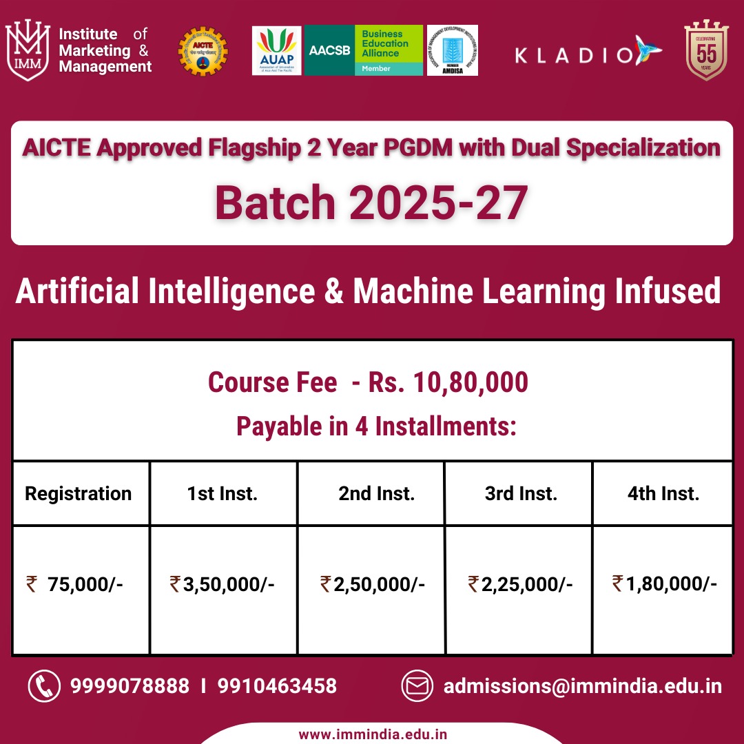 PGDM at Institute of Marketing & Management New Delhi is a 2 Years Diploma. The course is offered On Campus as a Full Time program. Institute of Marketing & Management New Delhi PGDM Total Fees is INR 10,80,000 for 2025.