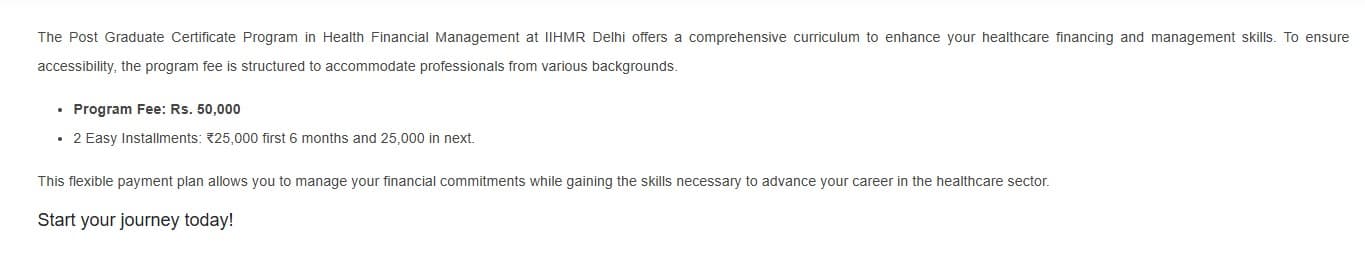 Earlier, PG Certificate Public Health Financial management fees at International Institute of Health Management Research New Delhi was ₹ 1 Lakh (in 2025) for the entire course duration. This shows a fee decrease of ₹ 50,000 over the year.