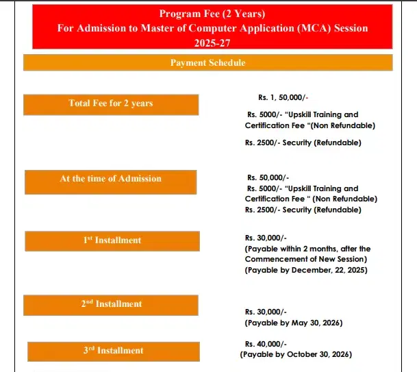 The total fee for the 2-year MCA program (2025–2027) is Rs. 1,50,000, along with Rs. 5,000 for upskill training and certification (non-refundable) and Rs. 2,500 as refundable security. At the time of admission, Rs. 50,000 plus the above-mentioned Rs. 7,500 is payable. The 1st installment of Rs. 30,000 is due within 2 months of session commencement (by December 22, 2025). The 2nd installment of Rs. 30,000 is payable by May 30, 2026, and the 3rd installment of Rs. 40,000 is payable by October 30, 2026.
