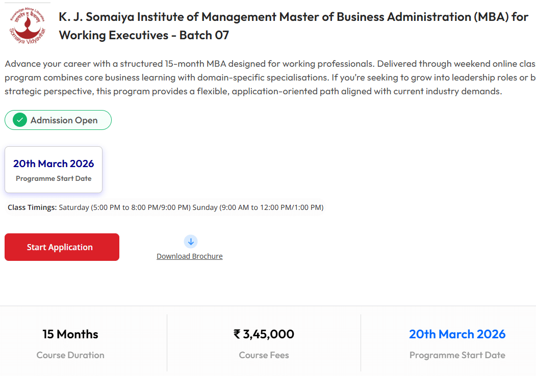 MBA at KJ Somaiya is a 1 year 3 months, Part Time Degree program offered Online.