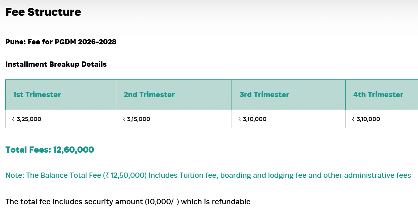 Earlier, PGDM fees at Kirloskar Institute of Management Pune was ₹ 12.6 Lakhs (in 2024) for the entire course duration. This shows a fee decrease of ₹ 3.95 Lakhs over the year.