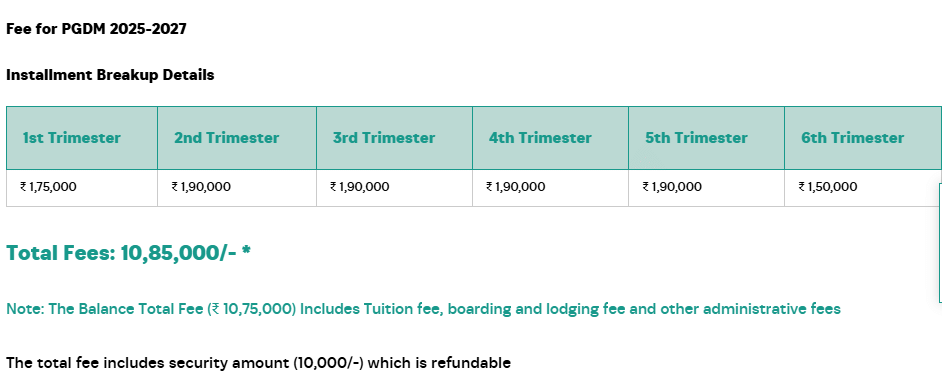 Earlier, PGDM Marketing fees at Kirloskar Institute of Management Harihar was ₹ 10.85 Lakhs (in 2024) for the entire course duration. This shows that the fee has remained unchanged since 2024.